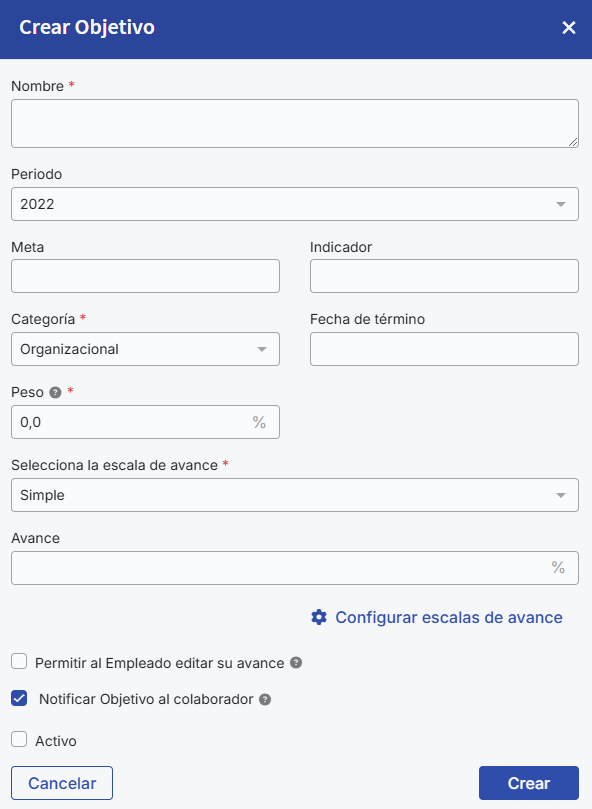 - Restrict the period for uploading and modifying objectives: By clicking this checkbox two new fields will open, which serve to provide a time window in which objective information can be uploaded or modified. The idea is to leave a window for leaders and employees to create objectives.