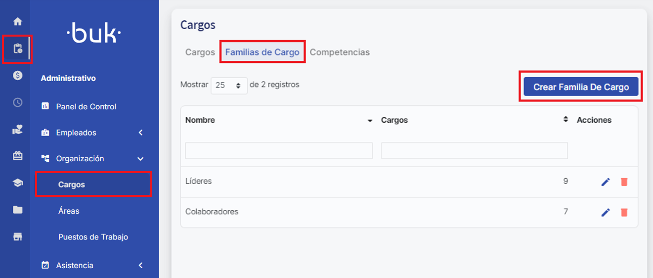 To create a job family, first go to the "Familias de Cargos" tab and click on "Crear Familia de Cargo."