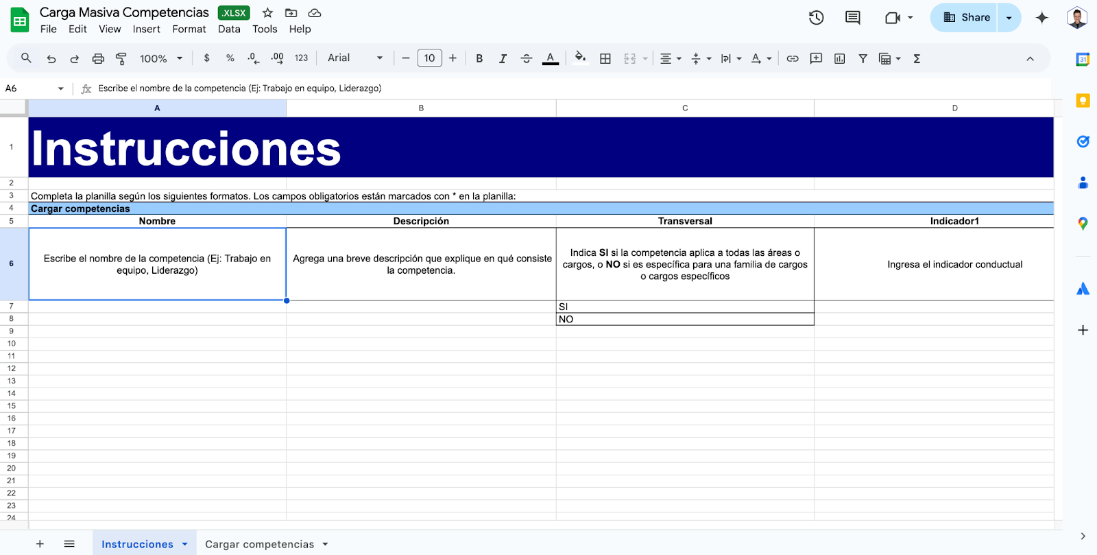 In the Excel file, you will find two tabs. The "Competencia" tab shows the list of competencies you have created. This tab serves as a guide for uploading indicators for each competency; you should not modify it.