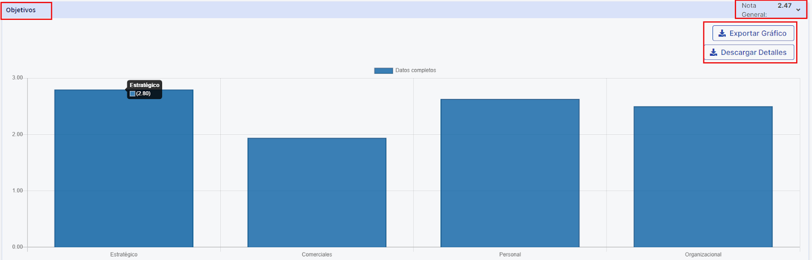 You can also review the "Objectives" tab, where you will find a chart that represents the scores of the objective categories evaluated in the evaluation