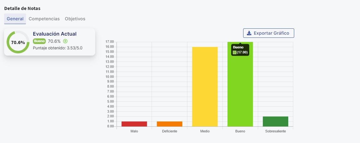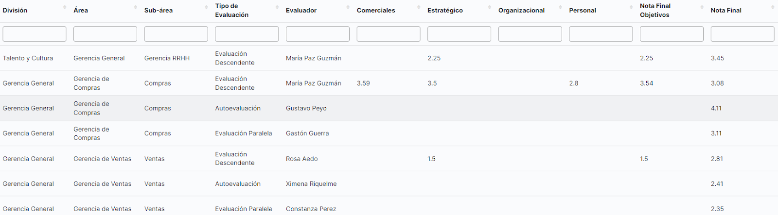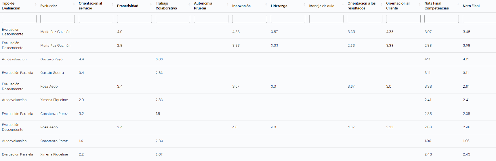 Remember that the final score per evaluation type will depend on the form configuration, including whether competencies and objectives were evaluated, as well as the weights assigned to each.