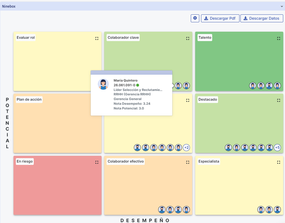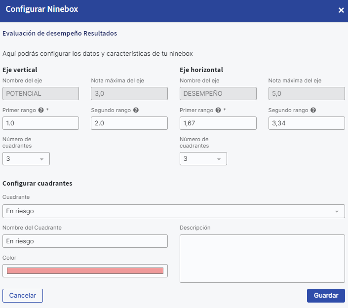 To configure the data and characteristics of the Ninebox, click the gear icon. You can adjust the variables and select the number of quadrants the N-box will have on each axis. In addition, you can modify the maximum values of the ranges, which will automatically redistribute employees into the quadrants according to the new range definitions.