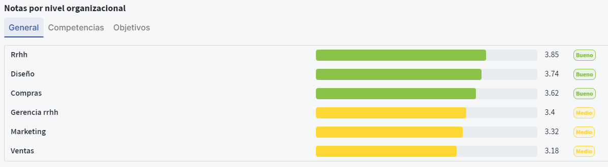 In "Scores by organizational level" you can review the overall results, as well as the results by competencies and objectives, corresponding to thesubareasof the organization.