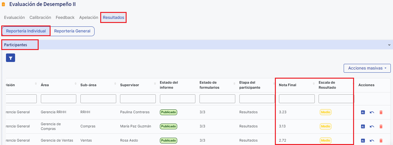As participants progress in the evaluation, you will be able to consult their "Final score" and, in "Results Scale", see which category each employee falls into according to the results scale configured in the evaluation.