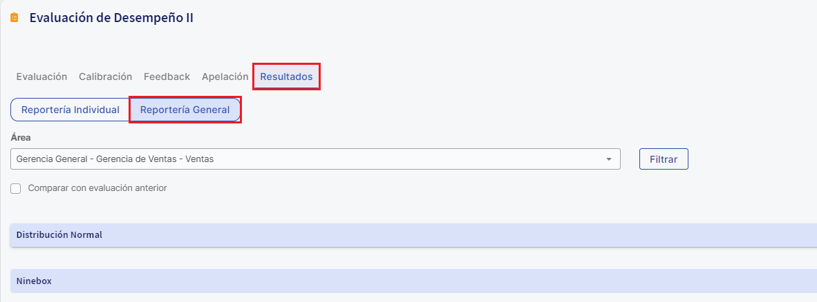 In the "General Reporting" tab you can review the evaluation results at the organizational level. You will find information such as the Normal Distribution chart, the Ninebox (in case potential questions were evaluated) and the details of the scores at the organizational level.