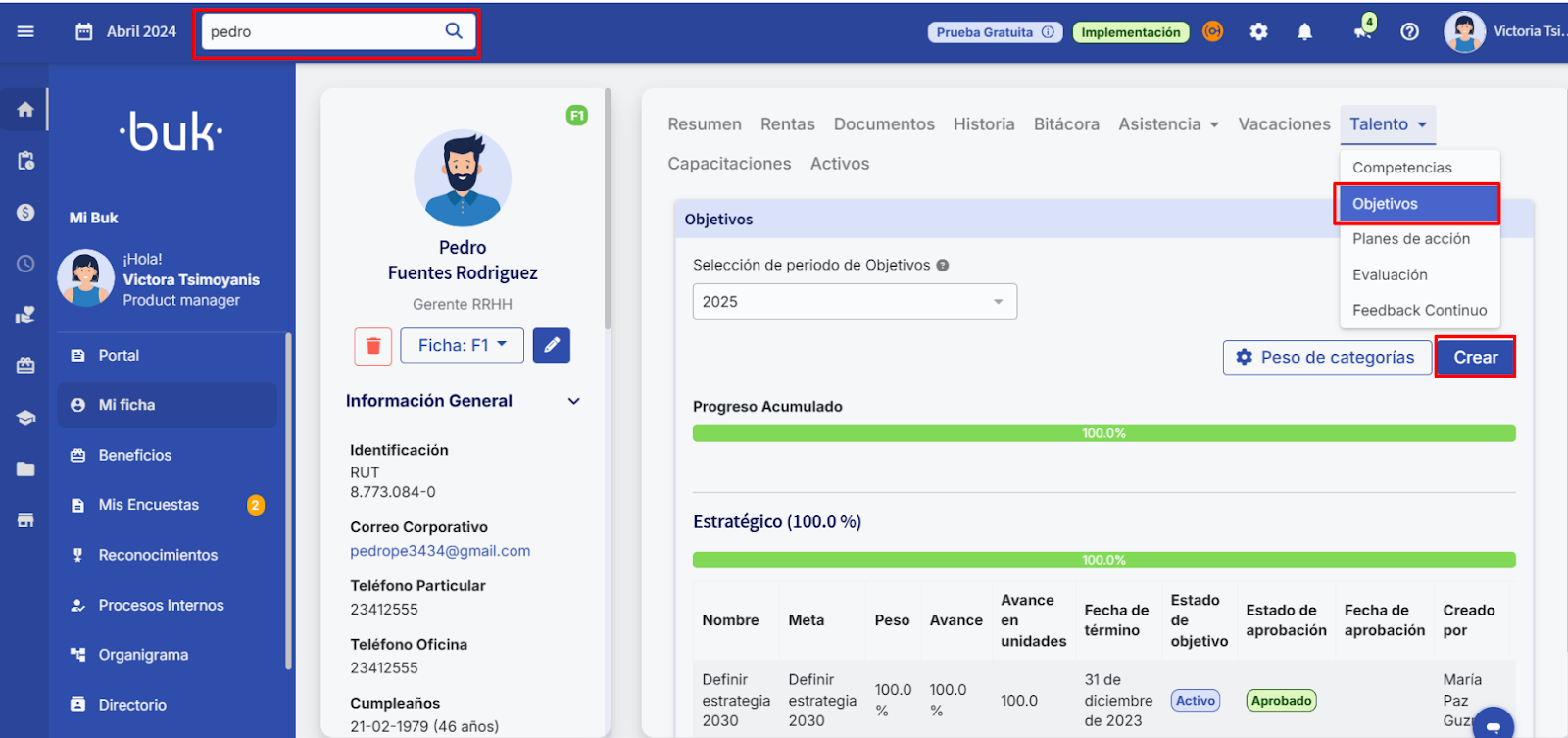 To assign an objective individually, first access the employee’s profile using the search. Once inside, go to the "Talento" section and select the "Objetivos" tab. Then choose the corresponding period from the period selector. You can review objectives assigned in previous periods and manage those for the current period (as long as it is open).