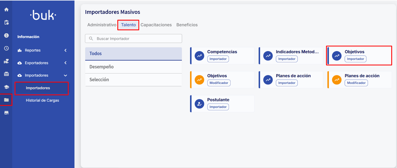 You can import objectives in bulk using Excel templates. To access this option, go to the"Information"module, select the"Importers"section and then again select"Importers". Within the available categories, choose"Talent"and then"Objectives (Importer)".