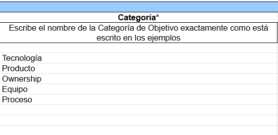 Range between 0 and 100Keep in mind that some fields have default options depending on your platform configuration. For example, in our case, the "Category" field shows options such as Tecnología, Producto, Ownership, Equipo, Liderazgo or Proceso. However, theseare only examples