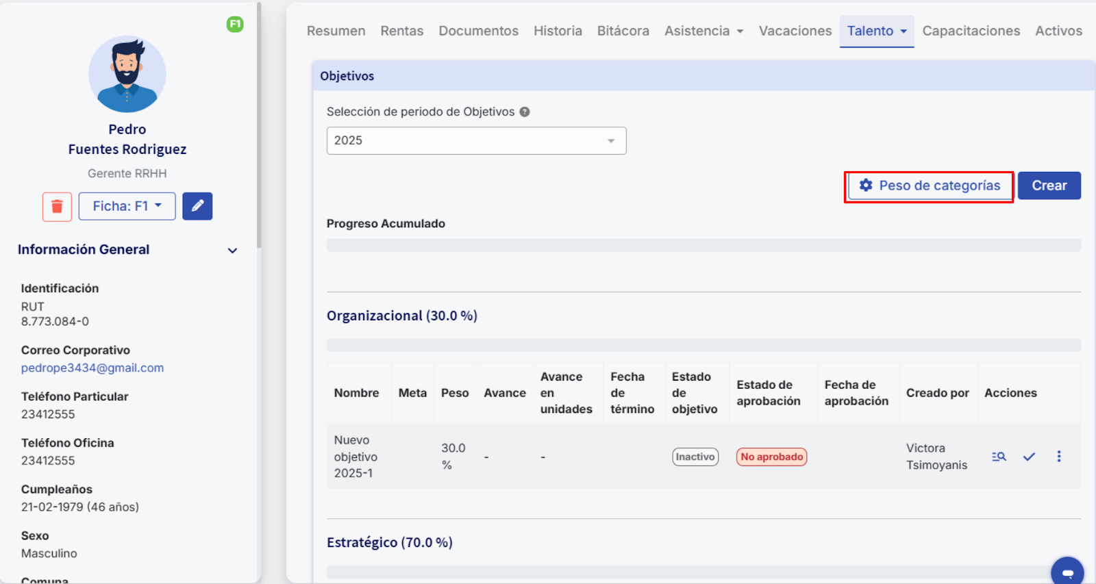 Once objectives have been created within the different categories, you can assign weights to each to calculate the accumulated progress chart. To do this, go to the "Objetivos" section within the employee’s profile and click "Peso de categorías".