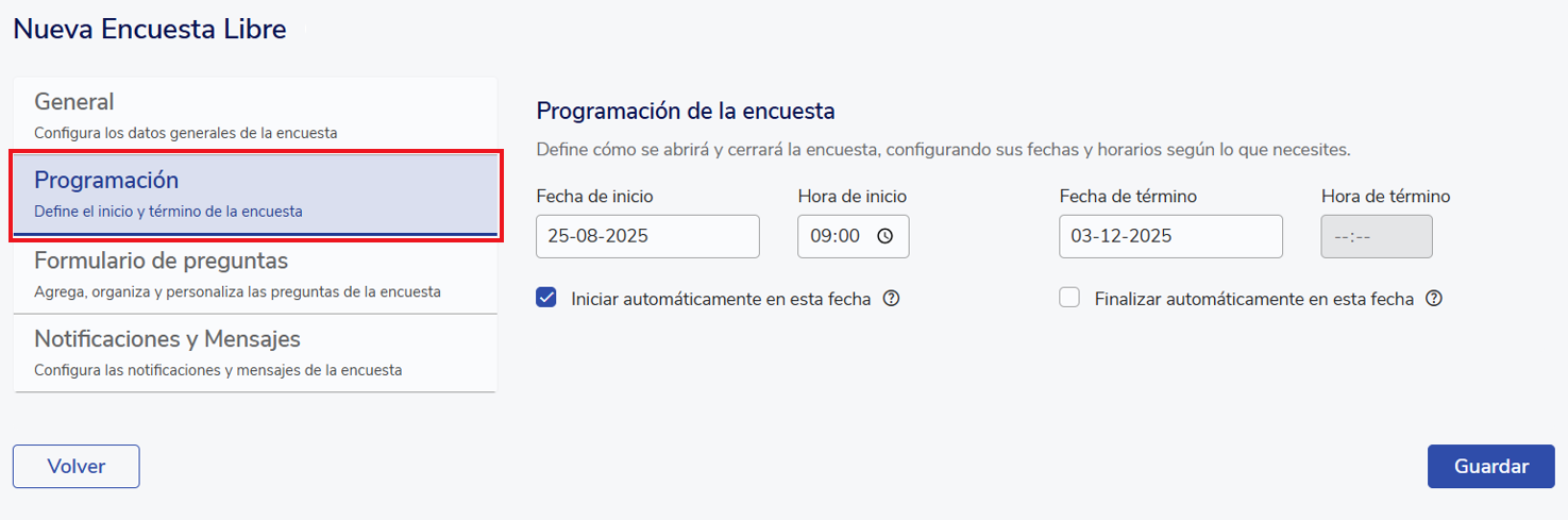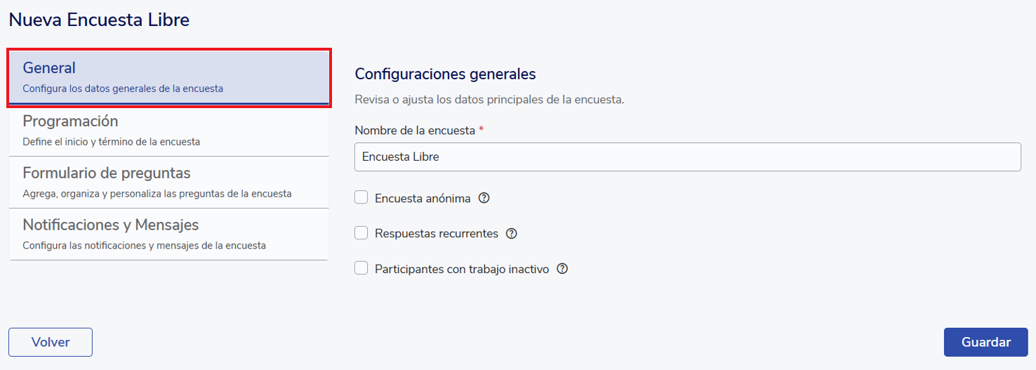 When creating a survey, it is divided into 4 sections: general, scheduling, question form, and notifications and messages.