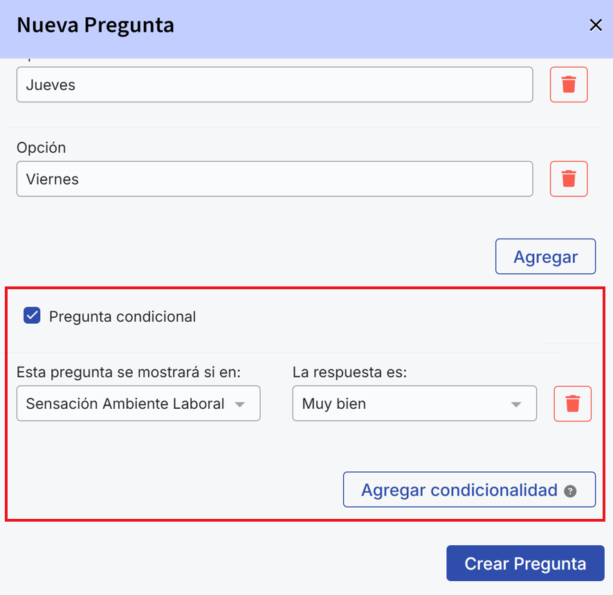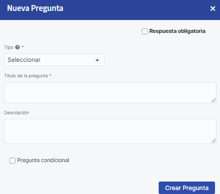 What types of questions can I use in a free survey?At the end you can define whether the question is conditional. This feature allows deeper customization of forms based on participants' answers. When activating it, you must select the question and the answer conditions that must be met for the conditional question to appear. In the list you will find the single-selection questions available to use, as well as the response that must be given for the conditional question to be shown.