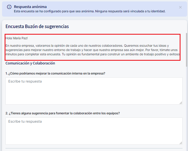 - Recurring Responses: Employees will be able to answer the survey whenever necessary. This functionality allows continuous feedback in recurring processes, such as hiring and training. Additionally, it enables creating surveys intended to function as suggestion and idea boxes, thus providing a versatile tool for continuous improvement.