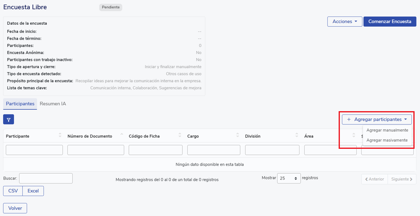 When you save the survey settings, this view will open to add participants; you can do it manually or in bulk.