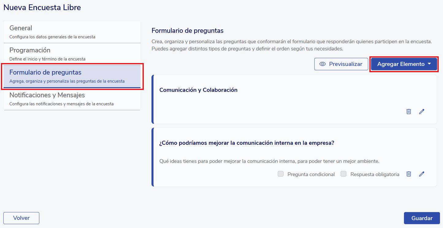 In the third section you must configure the question form that survey participants will answer. To add elements click on "Add Element". There are several options here, since questions can be included manually or by importing them. Also, to customize the survey, you will have the option to include titles, paragraphs, links to YouTube videos, and images.