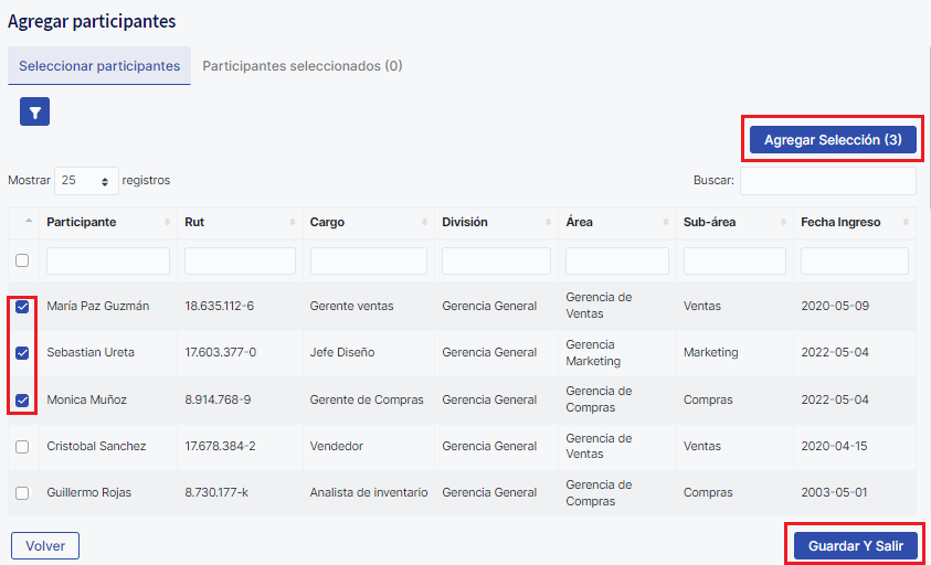 Bulk upload in Free SurveysTo add participants manually, this button will open another window where you must select the employees who will participate in the survey. Once selected click "Add Selection". Then, click "Save and Exit".