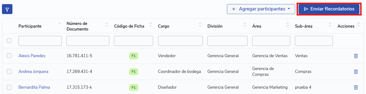 Reminders can be sent manually from the participants tab. Automatic reminders, if configured, are sent by email to participants who have not responded, on a daily basis until the closing date or until they respond.