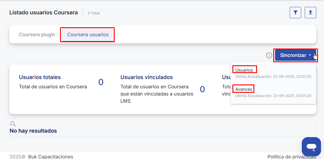 - Synchronize progress:allows you to bring course progress from Coursera into the LMS. This synchronization is performed automatically every night, so there is no need to run it manually.