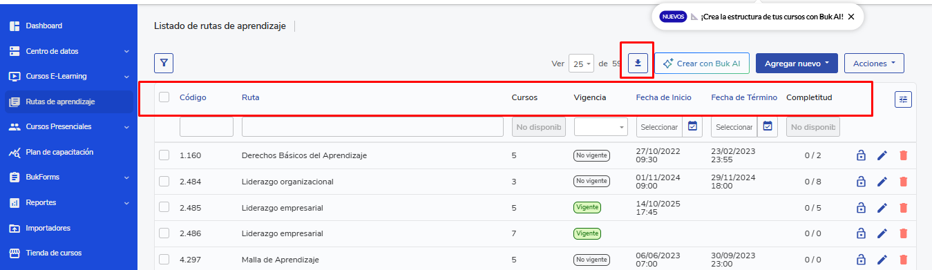 Next, you will see a list of all existing learning paths, with their respective: