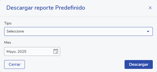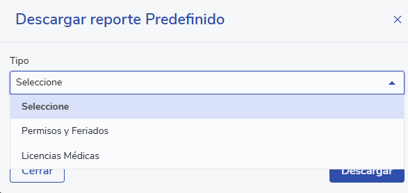 - The Download Predefined Report modal will open, and from the Type dropdown list you can choose between: Permisos y Feriados, Licencias Médicas, and soon Cometidos. In the Month field, you can select the month for which you want to download the report. Finally, click Download. This will download an Excel file in the format required by SIAPER, so you can upload it directly to the platform.