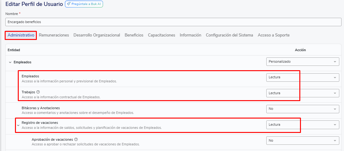Also, a user with area limits will only be able to view requests associated with their area, and the administrator of your Buk platform must assign you the corresponding profile.