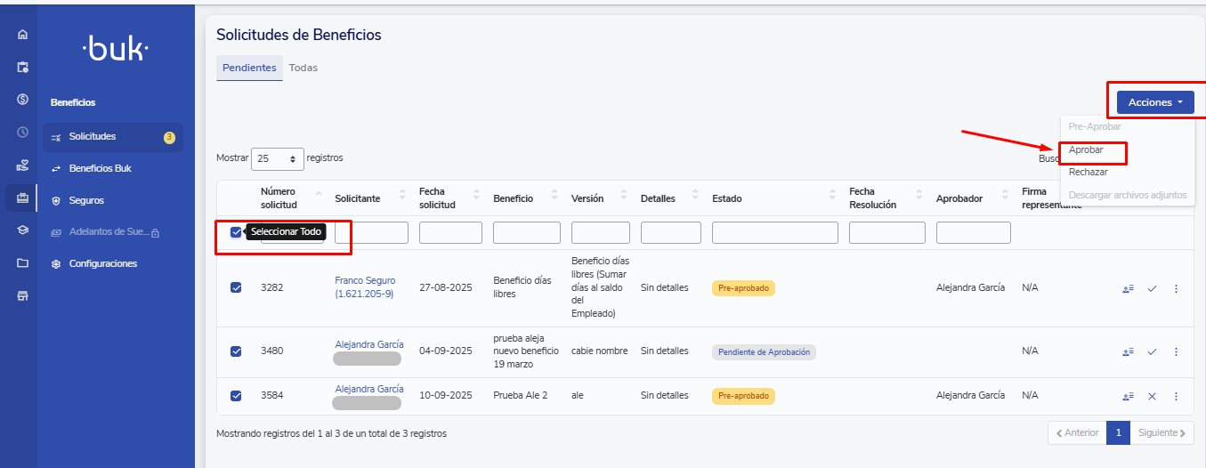 - Bulk approval:Select the “Select all” checkbox and then go to the right-side Actions → Approve button.