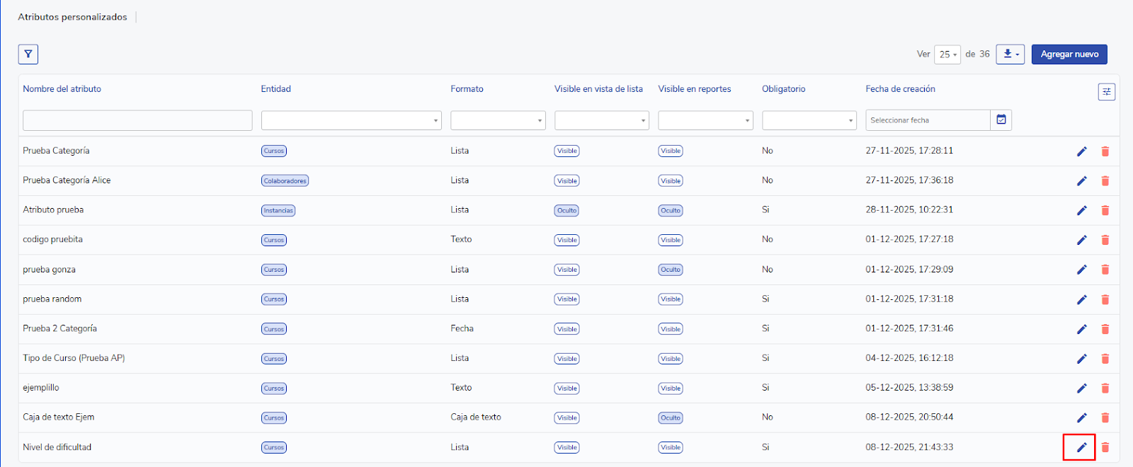 Step-by-step instructions on how to create, configure, and manage custom attributes in the LMS, considering the different available format types and management rules according to the associated entity.