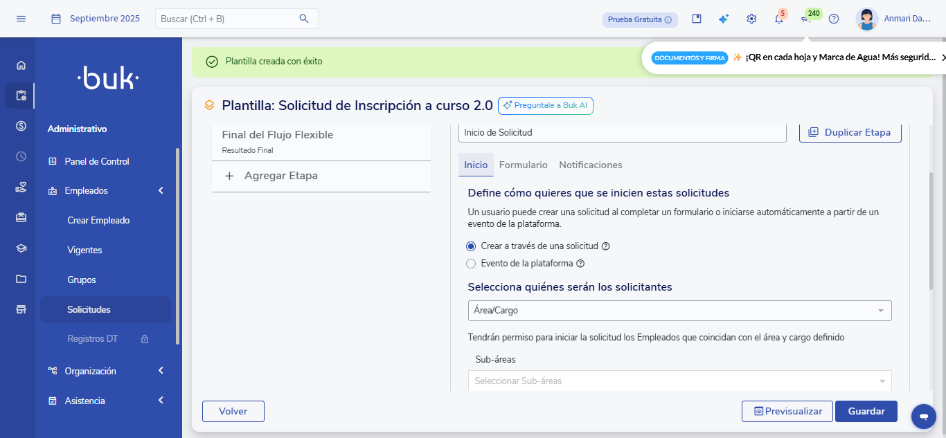 - In theStartsection, select the areas, positions, profiles or user groups who will be able to create the request.