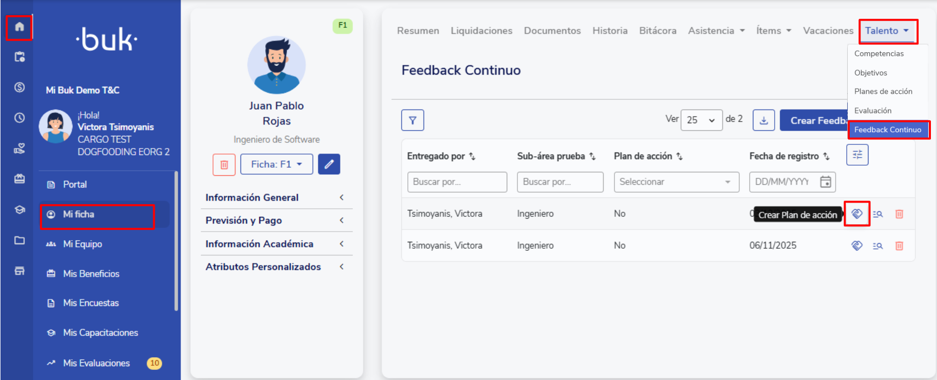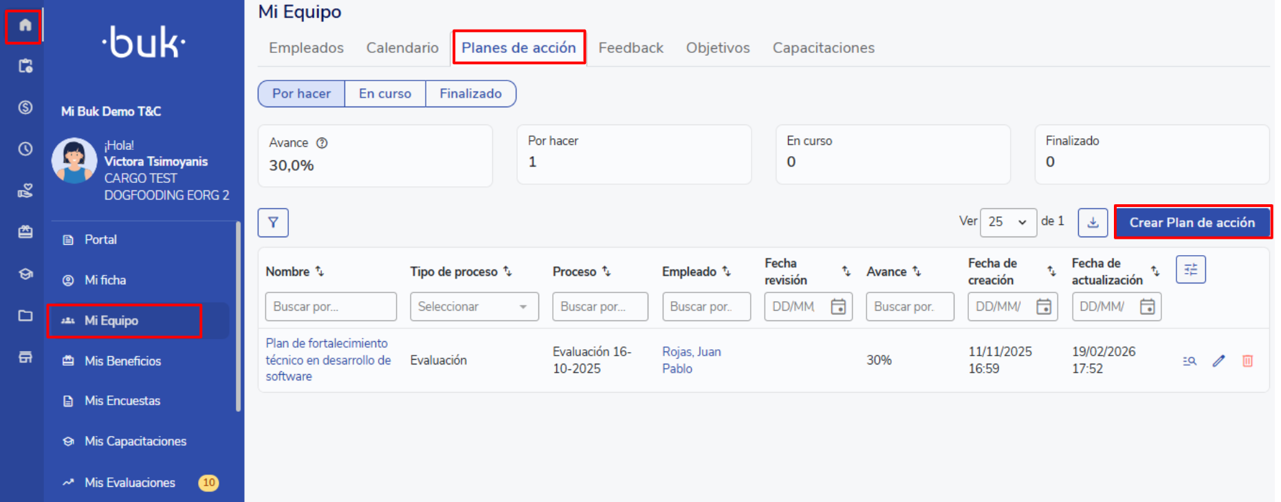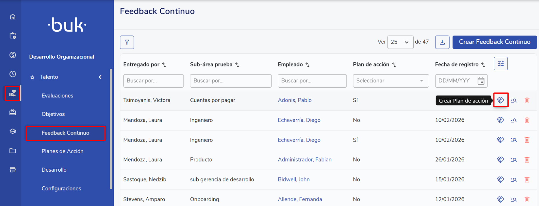 You can create action plans associated with Evaluations, Continuous Feedback, or Climate Surveys from each process's module, the employee's profile, or the general Action Plans module.