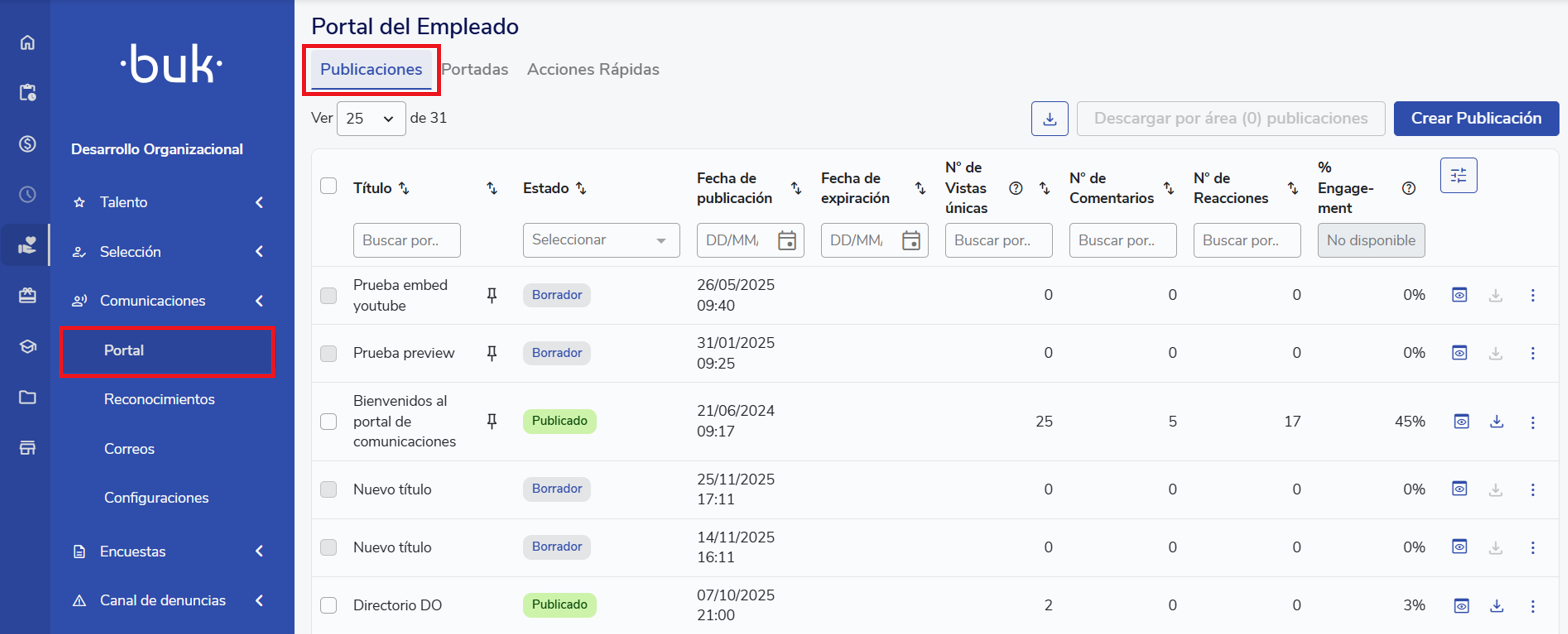 To create a new publication you must go toOrganizational Development > Communications > Portal and enterthe tabPublications. Here you'll see a table with all publications created so far; there you can edit or delete an existing publication from the post's 3-dot menu.