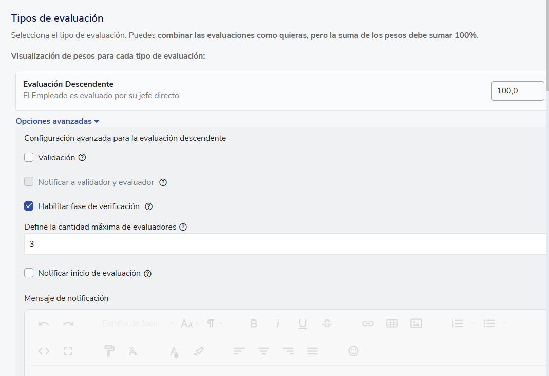 Para habilitar la fase de verificación en una evaluación, debes activar la verificación de evaluadores en los tipos de evaluación que escojas. Para esto activa el checkbox "Habilitar fase de verificación" en la configuración avanzada de cada tipo de evaluación durante la configuración de una evaluación de desempeño.
