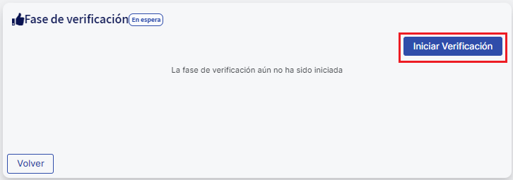 Luego, haz clic en "Iniciar Verificación" . Recuerda que mientas la fase de verificación esté en curso, no se podrá iniciar el proceso de evaluación ni modificar la configuración de los tipos de evaluación activados en el proceso (Esto considera activar/desactivar tipos de evaluación y cambiar la cantidad de evaluadores en cada tipo de evaluación).