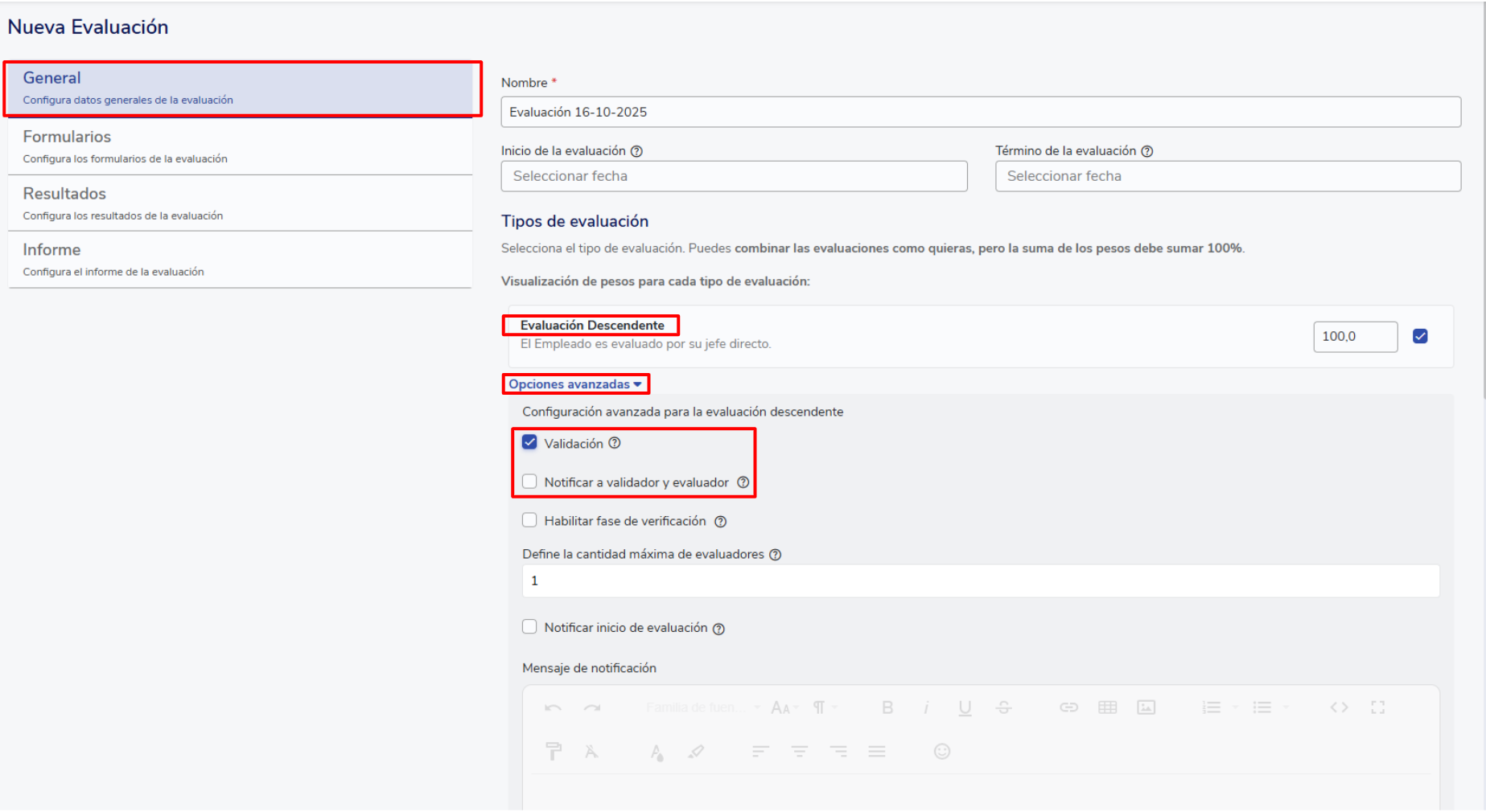 Además, podrás activar la opción “Notificar al validador y evaluador”, que envía una notificación al validador cuando debe validar una evaluación, y al evaluador cuando sus evaluaciones son validadas o rechazadas.