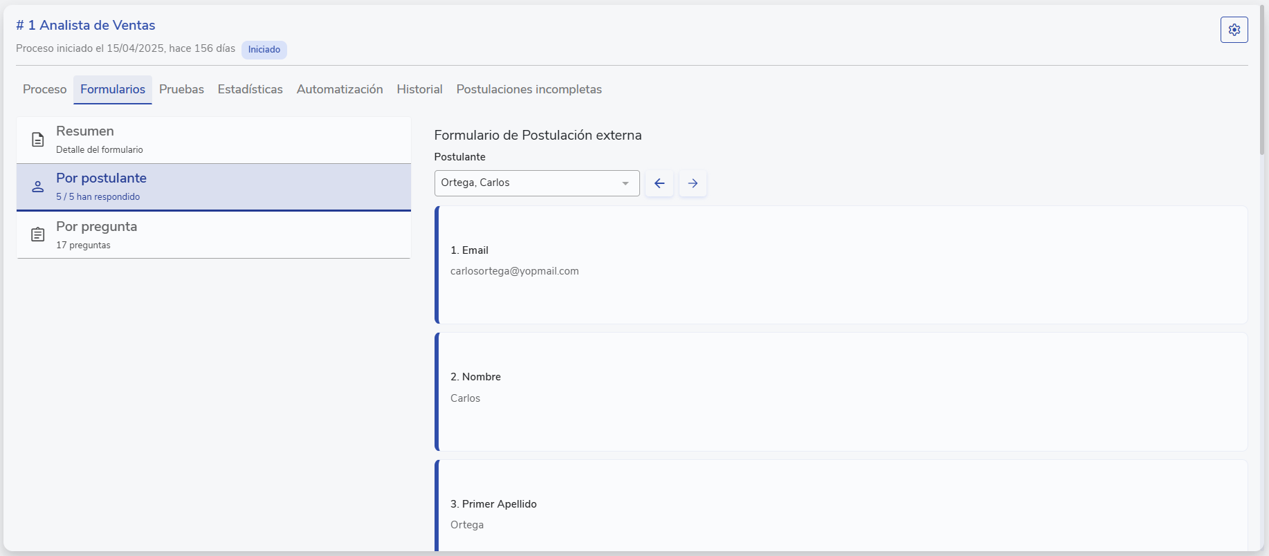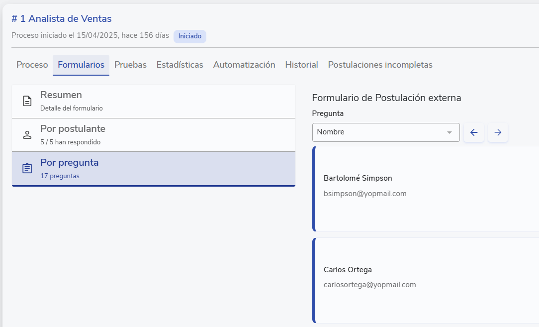 Al cambiar la pestaña a "Por postulante" podrás ver las respuestas por cada postulante