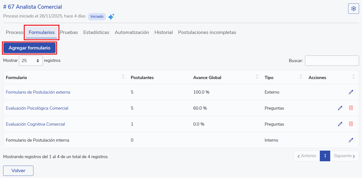 Al ingresar a un formulario dentro del proceso, llegarás al resumen de tu formulario, en donde podrás ver el estado de cada formulario enviado (por postulante)