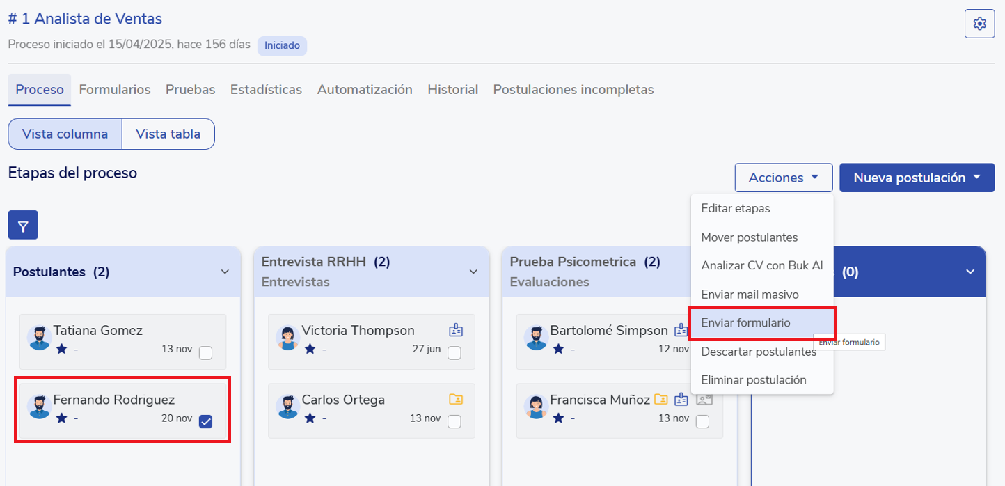 Una vez tengas creado tu formulario, desde la pestaña "Proceso" deberás seleccionar a los postulantes que quieras enviar el formulario y luego, presionar Acciones y Enviar formulario.