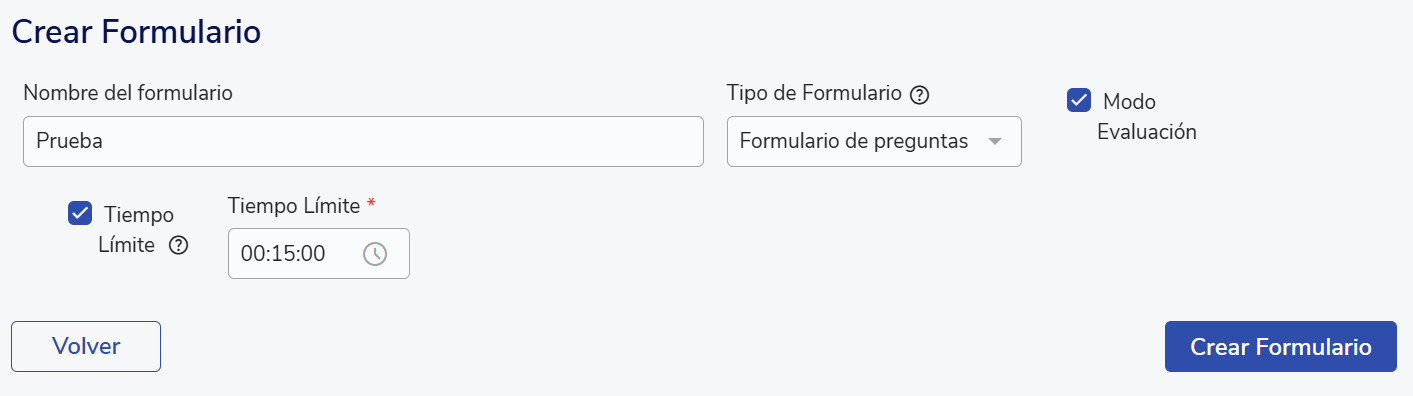 Para crear una prueba de selección, solo debes activar el "Modo Evaluación" en el formulario. También podrás indicar si quieres limitar la prueba por tiempo.