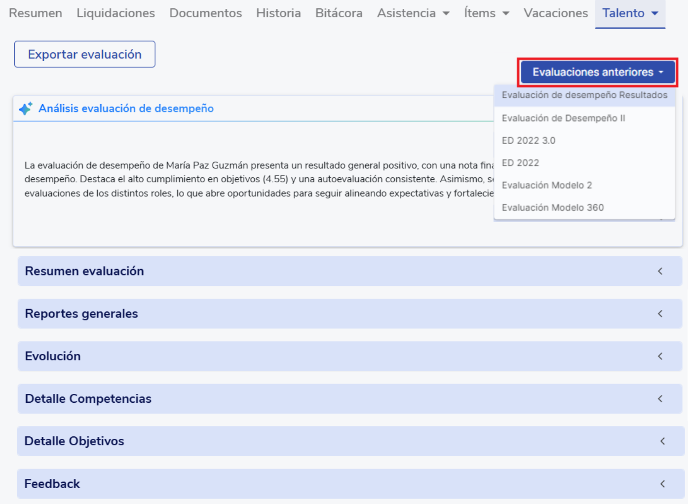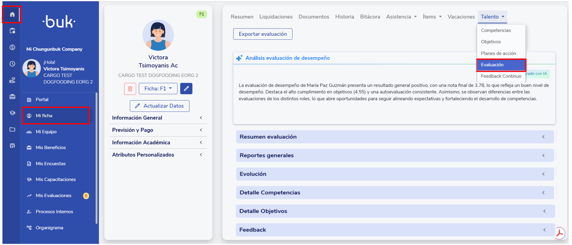 Una vez publicados los informes de notas de las evaluaciones de desempeño, tanto líderes como colaboradores podrán revisarlos directamente en su ficha. Para ello, deben ingresar a su ficha, seleccionar la pestaña "Talento" y hacer clic en "Evaluaciones".