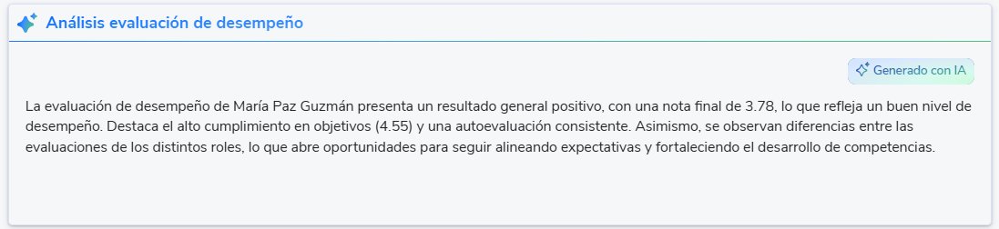 En esta sección se presenta un resumen generado con IA que muestra los principales resultados de la evaluación de desempeño. Este análisis le permite al colaborador comprender de forma rápida cómo fue evaluado su desempeño y detectar oportunidades de desarrollo.