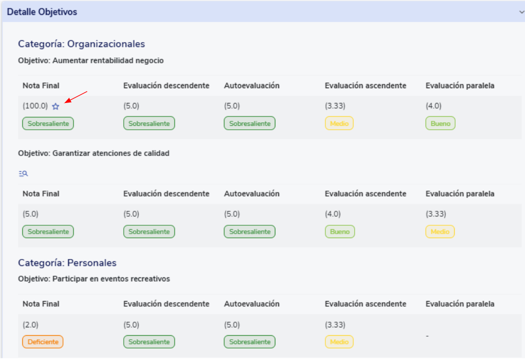 ★ Cuando veas una estrella junto a la nota de un objetivo, significa que ese objetivo tiene sobrecumplimiento. Esto ocurre cuando no solo se alcanza la nota máxima definida para el objetivo, sino que además se supera en al menos una evaluación.