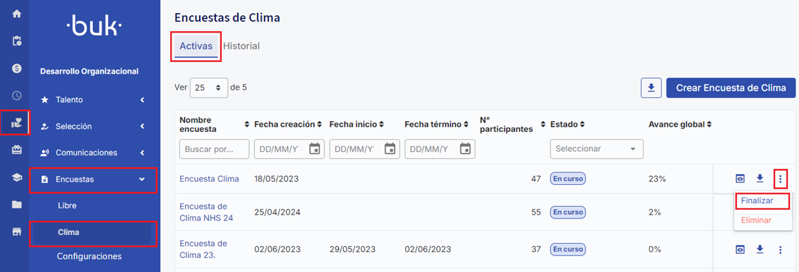 Para finalizar una encuesta de clima, dirígete a la sección "Desarrollo Organizacional" en el menú lateral y selecciona "Encuestas". Luego, en la pestaña "Activas", busca la encuesta que deseas cerrar. En la columna "Acciones", haz clic en "Finalizar" para completar el proceso.