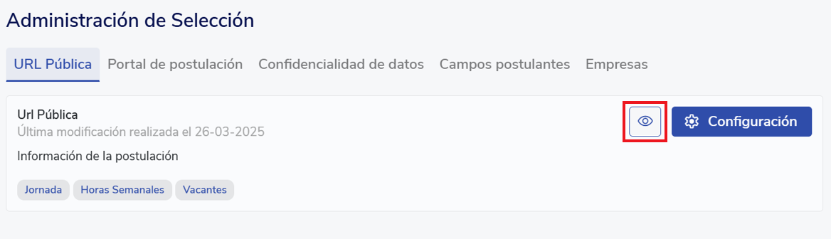 Puedes previsualizar cómo se verá una URL de un proceso de selección con un ejemplo al azar haciendo clic en "Volver", luego haz clic en "Previsualizar"