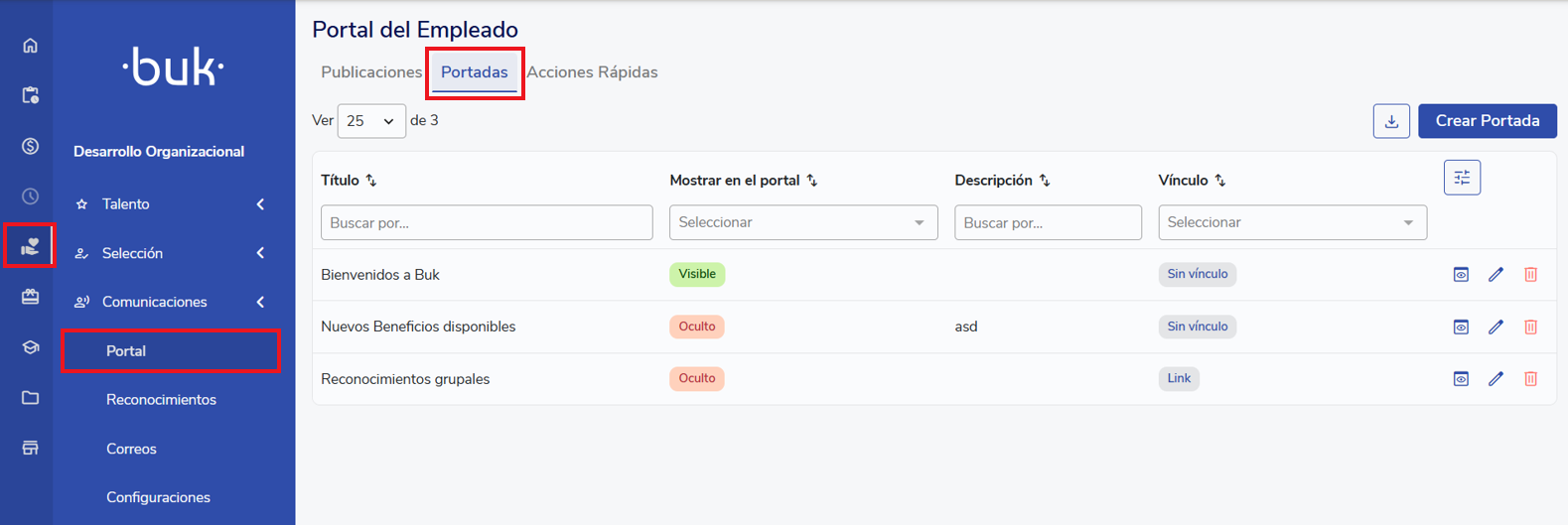 Para revisar las publicaciones subidas, estas se pueden ver en el portal de Buk, desde el símbolo de cada y luego Portal.