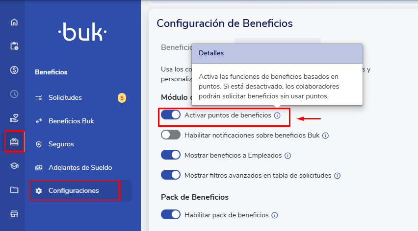 Puntos de beneficios: Es el monto que se descontará del saldo de puntos de un colaborador al aprobarse su solicitud de beneficios