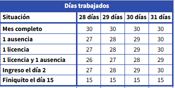 - Días trabajados: días en los que el trabajador efectivamente prestó servicios. Relevante en los casos de licencia médica o fracción de mes.
