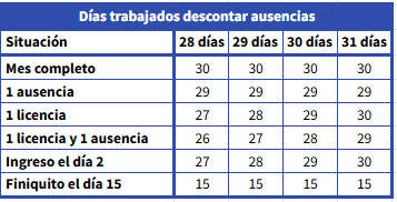 - Ausencias: en estos casos, se descuentan los días de ausencia a un mes trabajado completo. Es decir, a 30 días, se descuentan los días de ausencia.