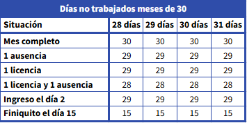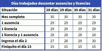 3. Días trabajados descontar ausencias licencias: en esta metodología tomamos siempre como base de cálculo 30 días y descontamos todas las ausencias, sean inasistencias o licencias.
