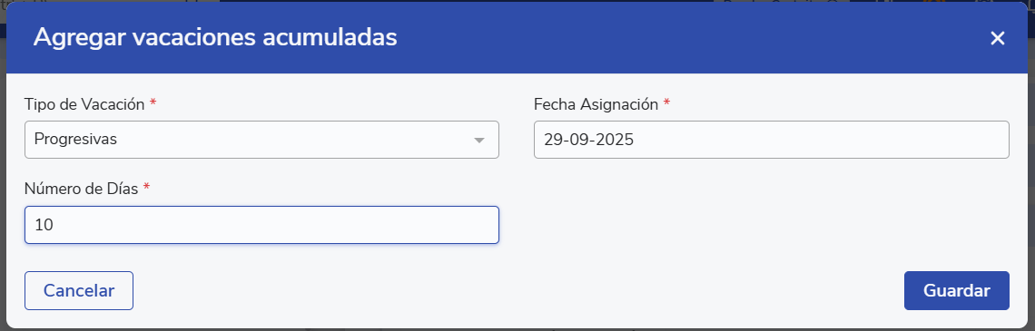 Importante: Si el colaborador al momento de entrar ya cumple con los requisitos necesarios para devengar días progresivos, además de ajustar la Fecha de Inicio de Vacaciones Progresivas, se debe cargar manualmente o a través de importadores los días acumulados.