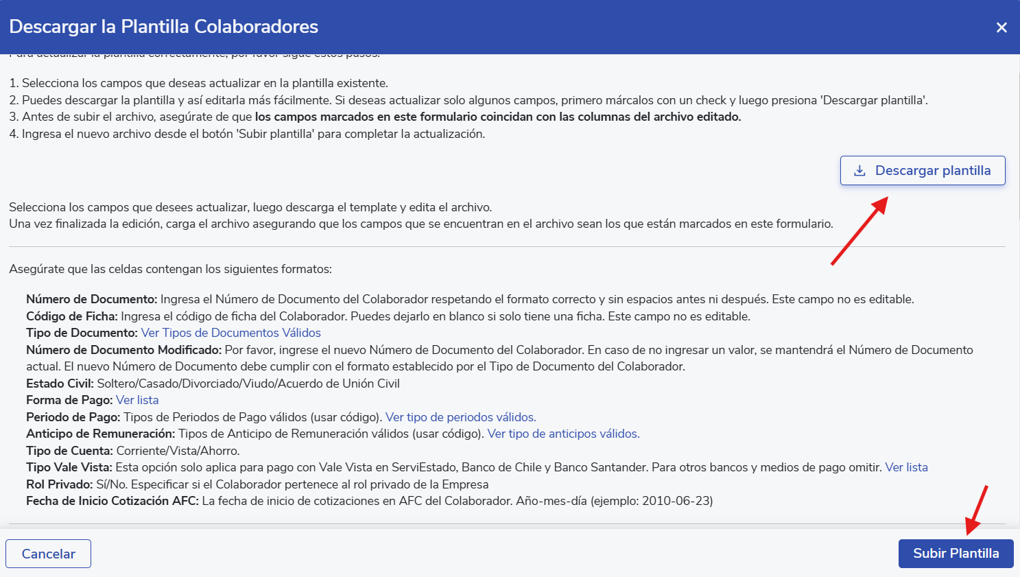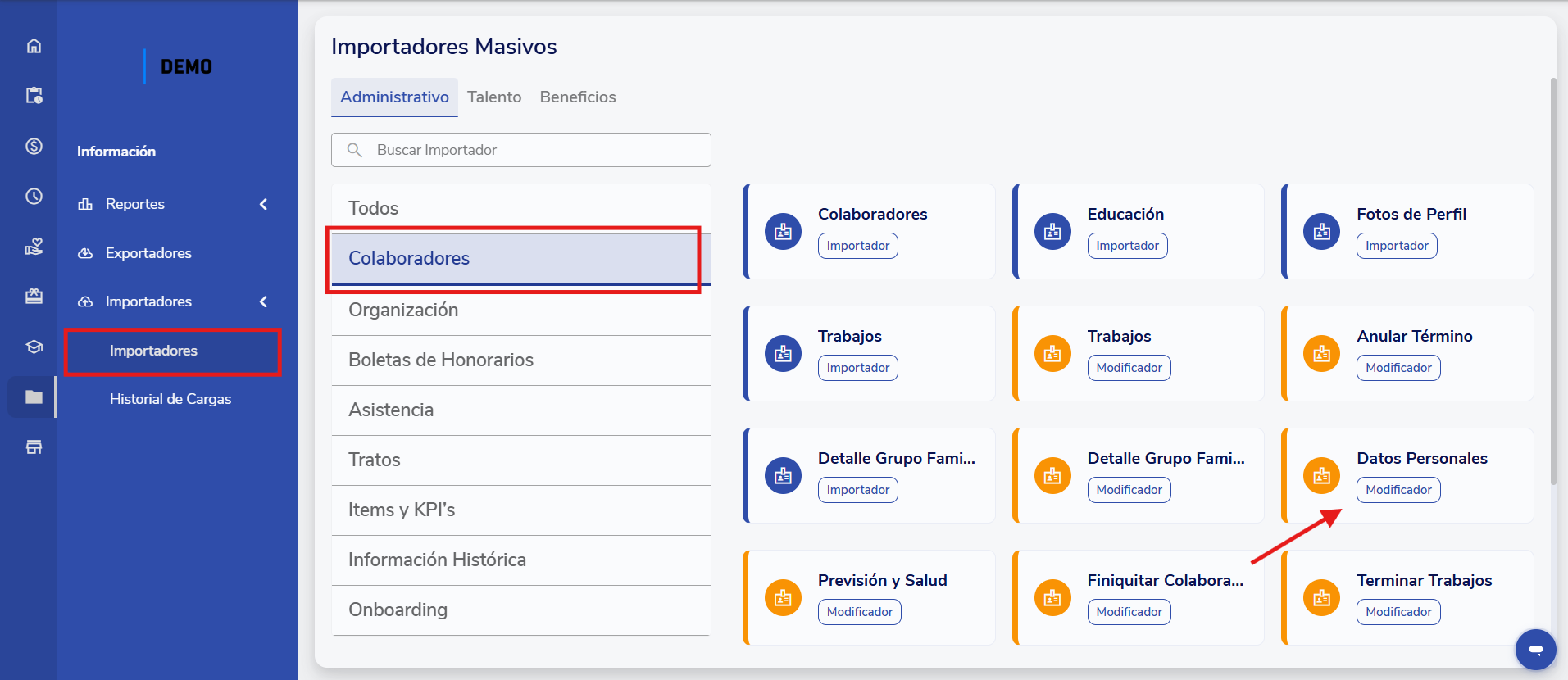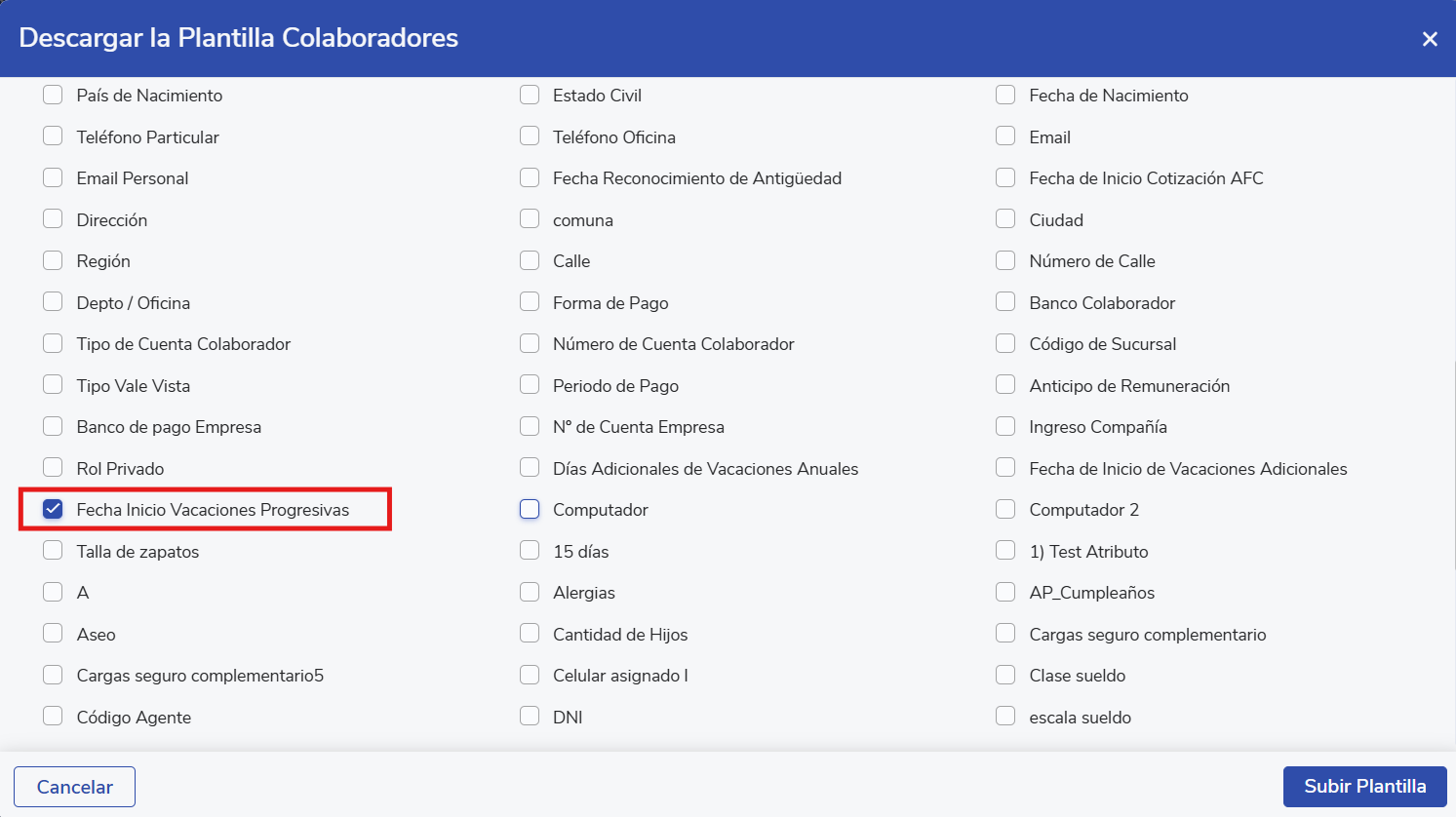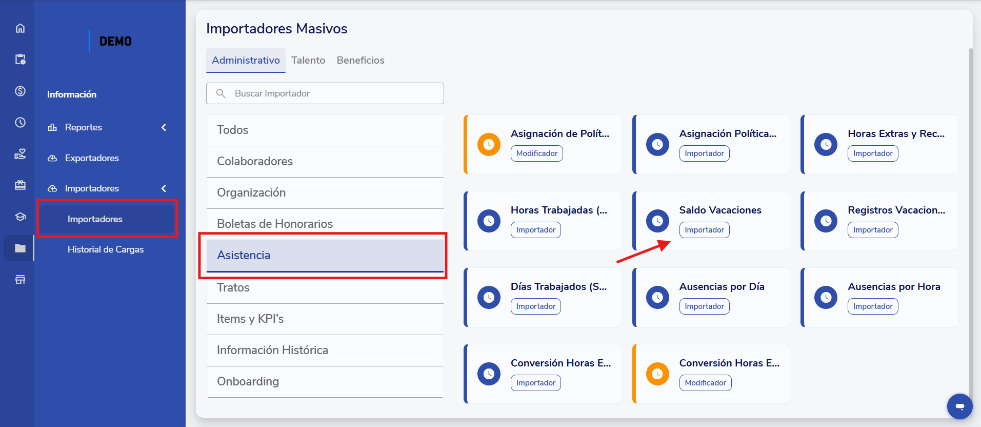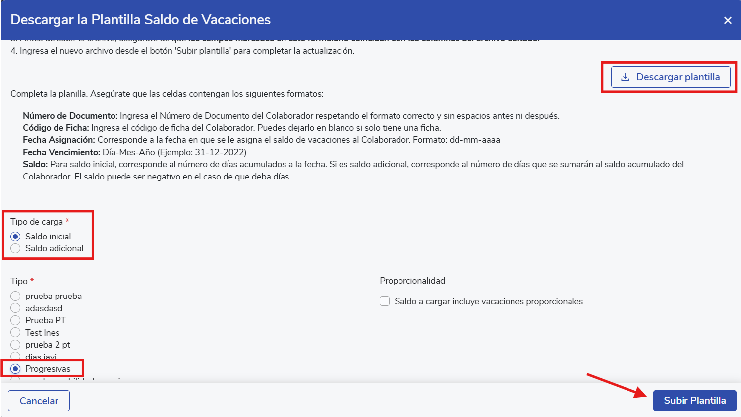 Por otra parte, puedes ingresar los saldos de Vacaciones Progresivas desde los importadores masivos usando el importador de "Saldo Vacaciones" ubicado en el grupo "Asistencia". Selecciona el tipo de carga y el tipo de vacación (Progresivas), descarga el template, rellena la información, guarda el archivo y sube nuevamente.