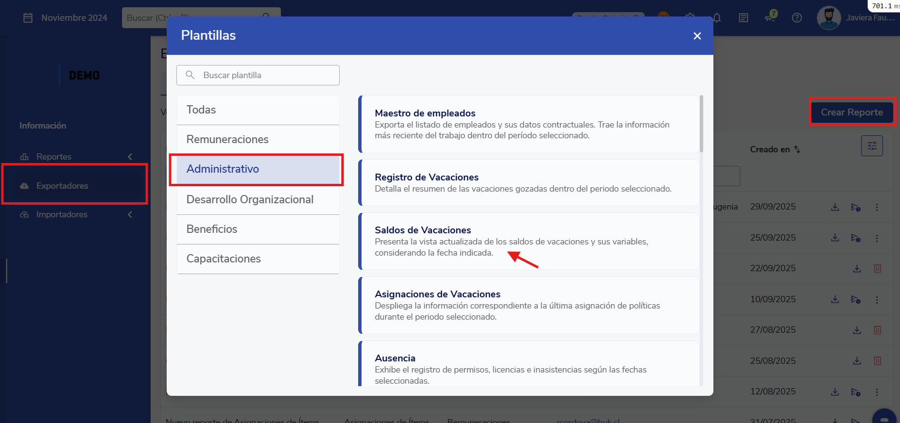 Para finalizar, puedes revisar la información del saldo de los días de vacaciones desde la ficha de cada trabajador o descargando un reporte desde los exportadores seleccionando la plantilla de "Saldo de Vacaciones" dentro del grupo de Administrativo.