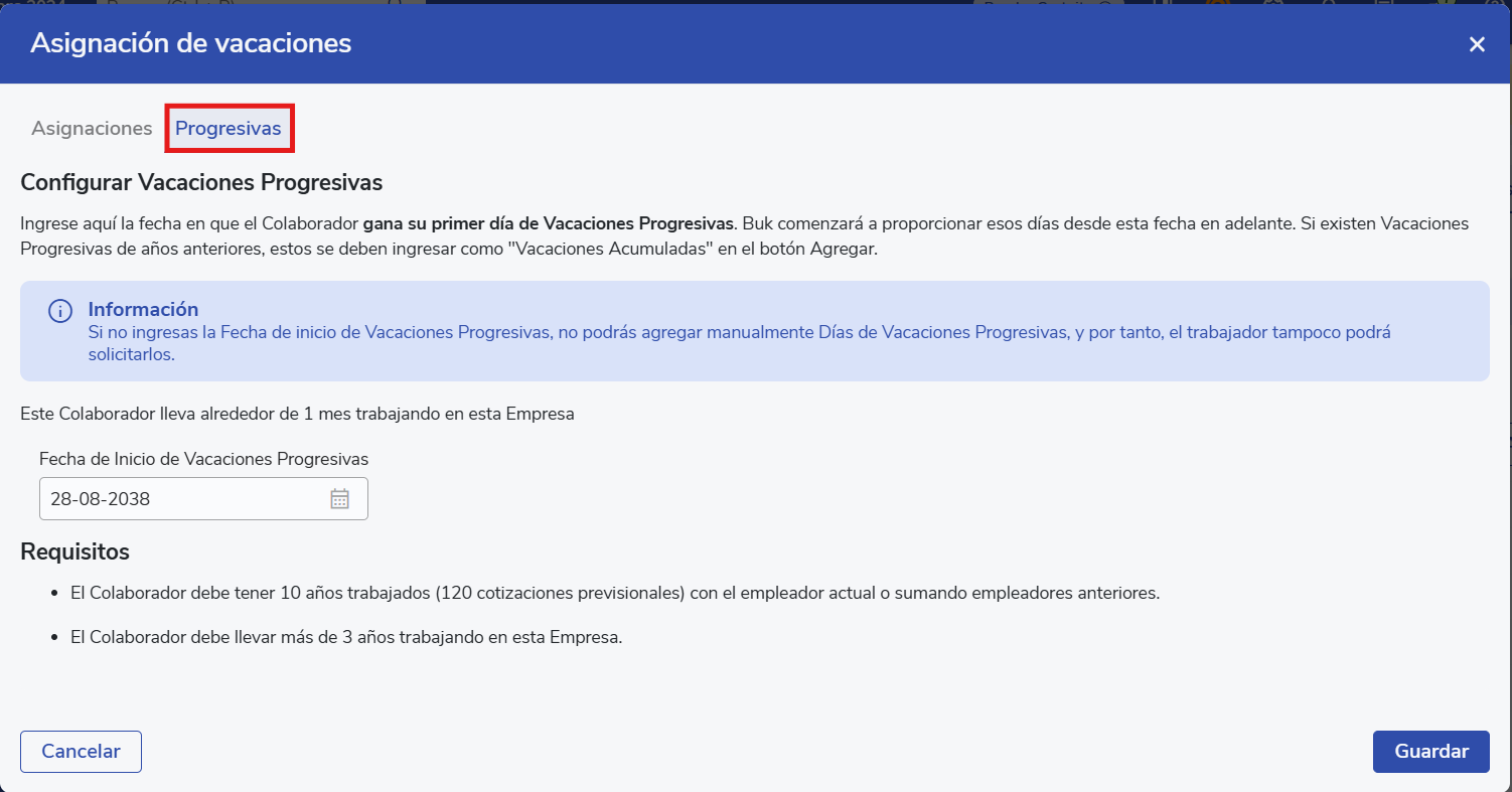 Respecto a la fecha de inicio de Vacaciones Progresivas, desde ahora en Buk, al crear nuevos colaboradores, estos ya vendrán con su Fecha de Inicio de Vacaciones Progresivas configuradas de acuerdo a su Fecha de Ingreso a la Compañía.